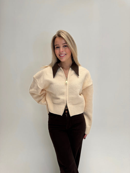 UitverkochtZoey leather collar knit cardigan - creme