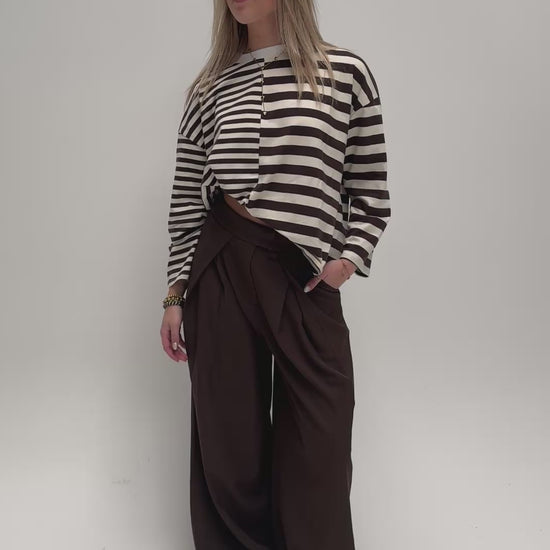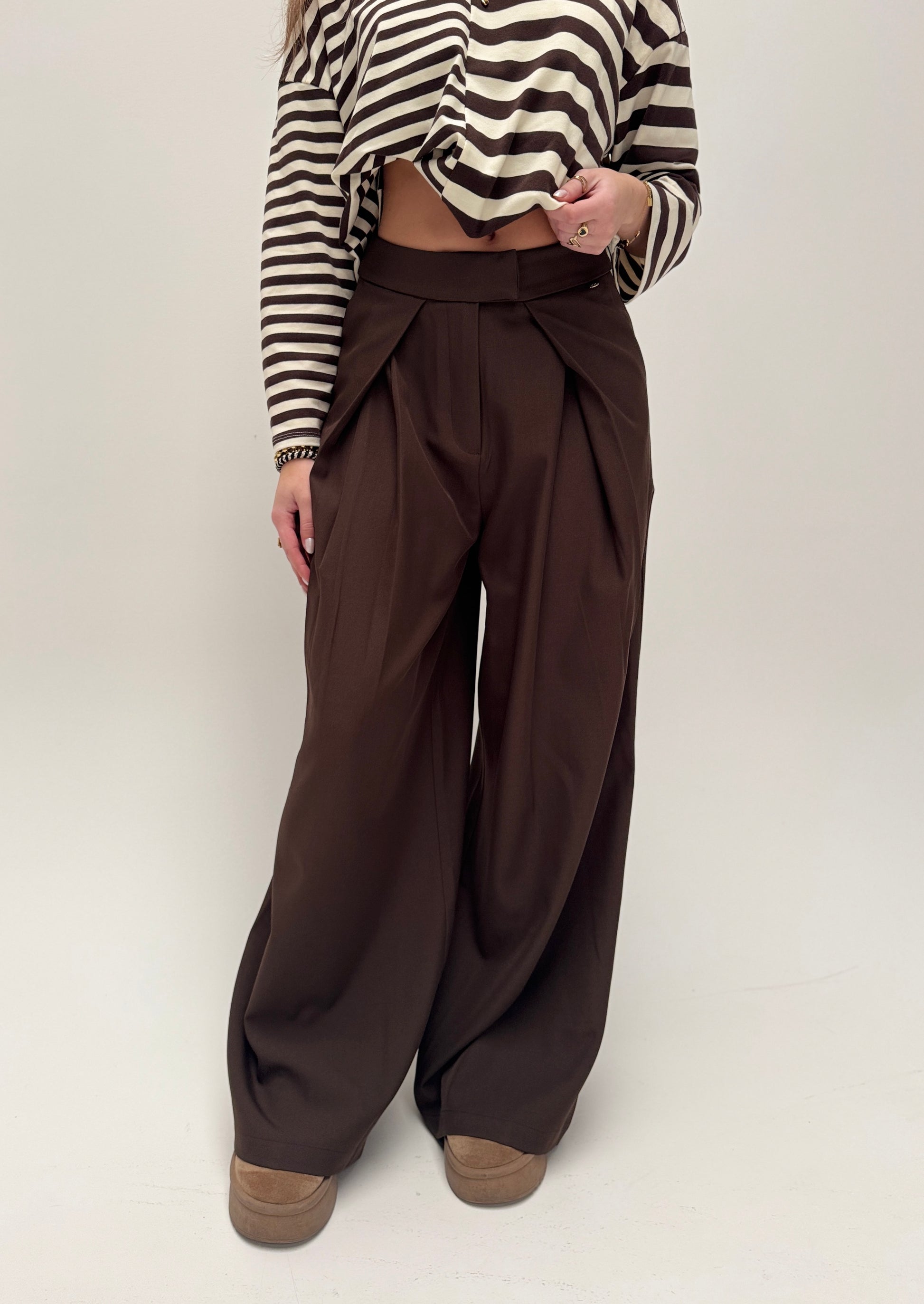 De pantalon die alles heeft! Deze chocoladebruine wideleg pantalon is de musthave voor een effortless trendy look! Met zijn hoge taille, diepe plooien en extra wijde pijpen geeft hij elke outfit een stijlvolle fit!