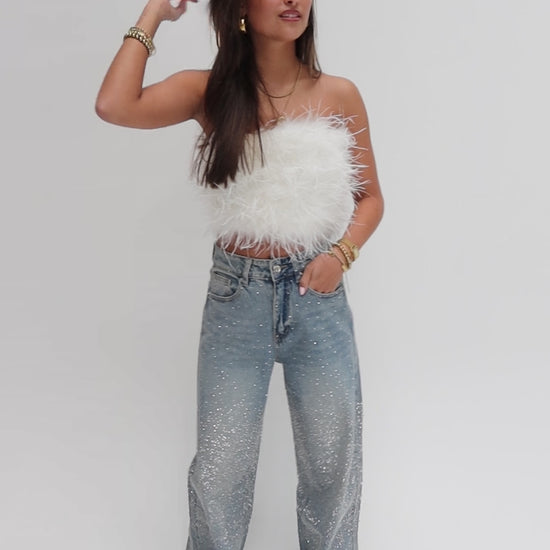 The ultimate party statement! Deze feather tube top is een echte eyecatcher! Superzacht, en perfect om iedere outfit helemaal af te maken! Perfect voor een avondje uit of voor een feestje! Ook mooi te combineren onder een blazer. De achterkant van de top heeft een rits.