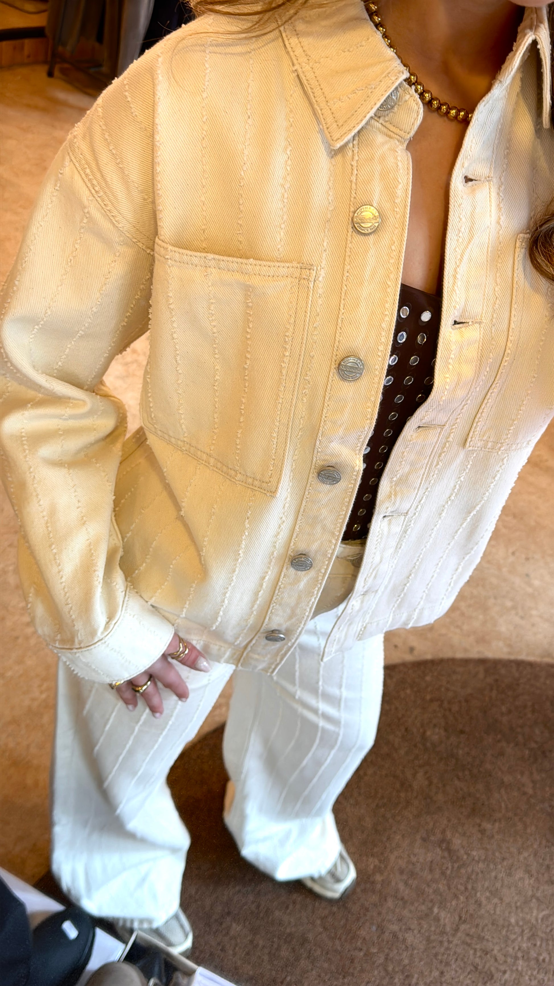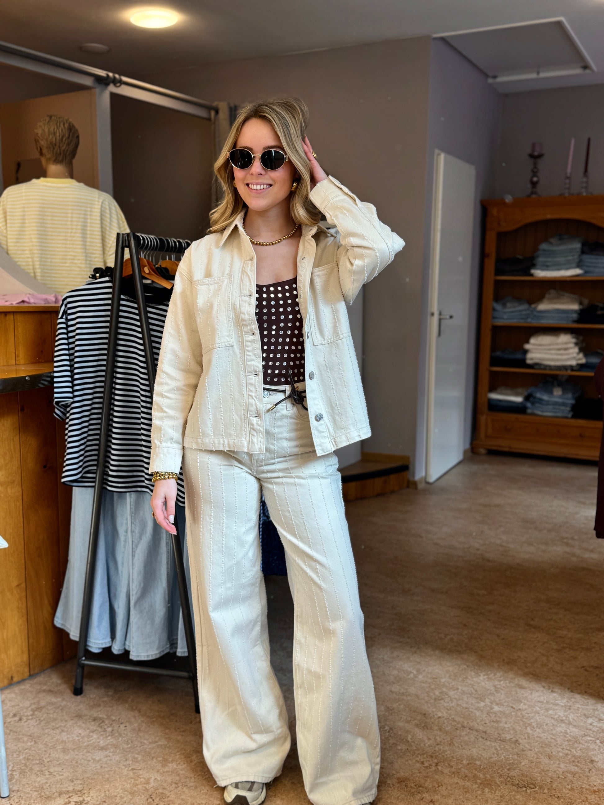 Onze Izi golden muse denim jacket in het beige is de perfecte mix tussen stoer en classy! Het jasje heeft een subtiele verticale structuur met mooie details. (valt ruim) Dankzij de rechte fit en stevige denimkwaliteit valt hij losjes en comfortabel om het lichaam