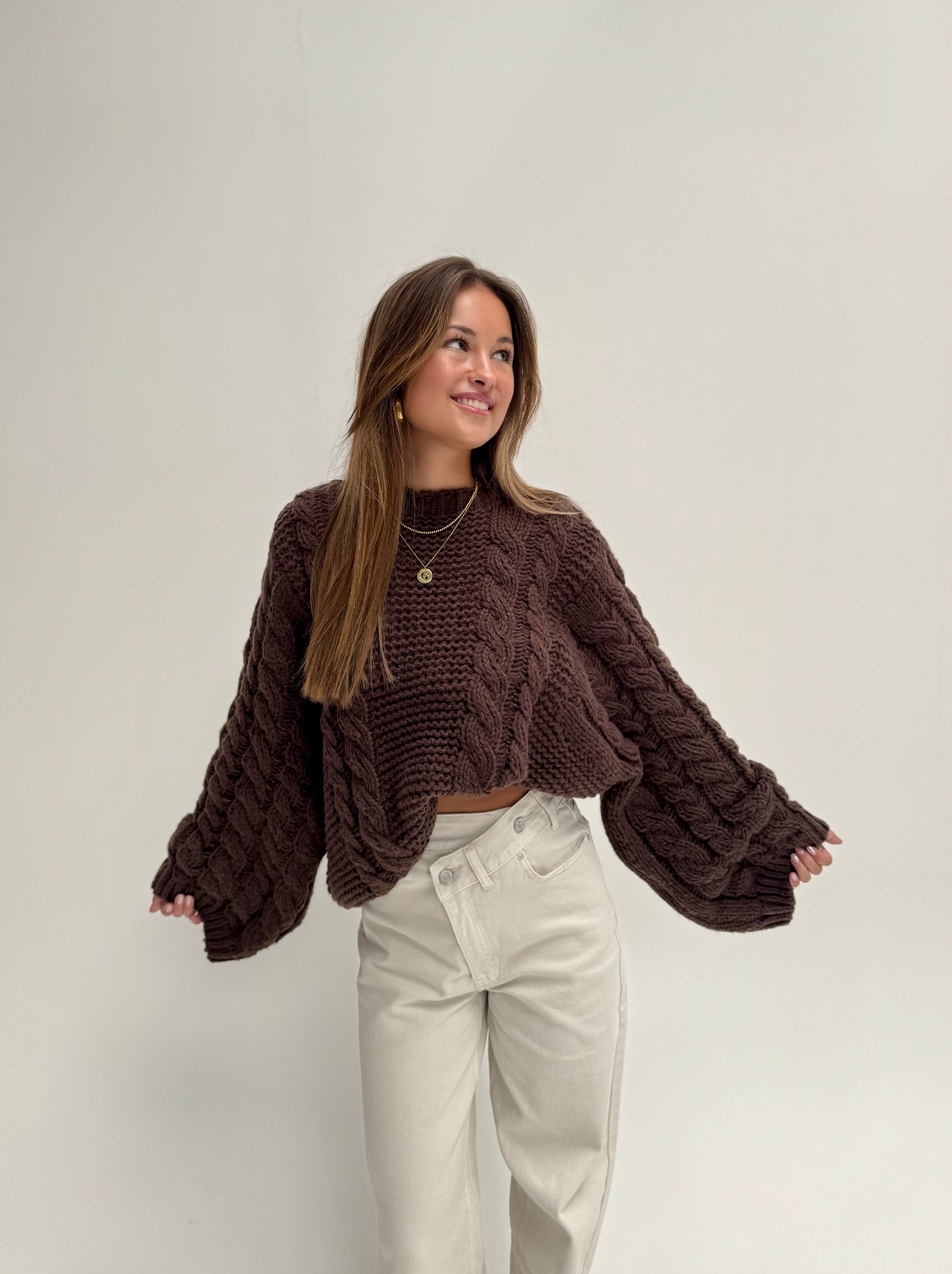 Deze trui is alles wat je nodig hebt dit najaar! De trui is wat grover gebreid, en valt wat oversized! De trui heeft een ronde hals met ballon mouwen!