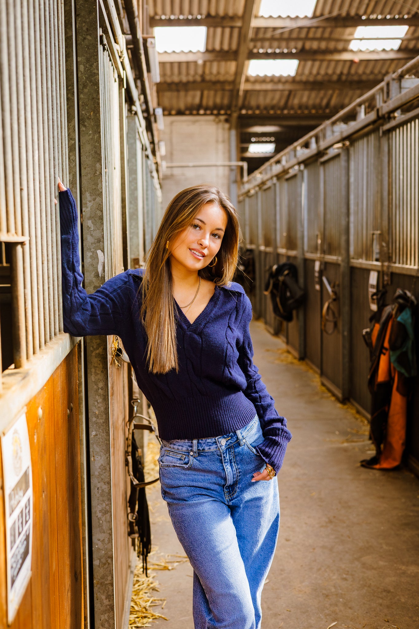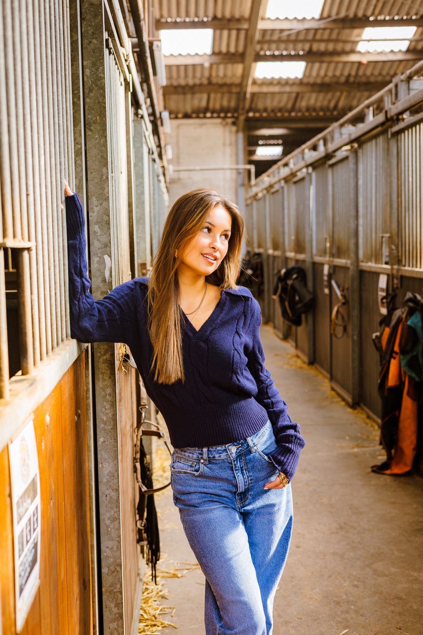 Wauw! Hoe mooi is deze nieuwe trui?! Perfect voor het herfst seizoen! De trui bevat een elegante V-hals met een kraagje en heeft een mooie aansluitende fit.