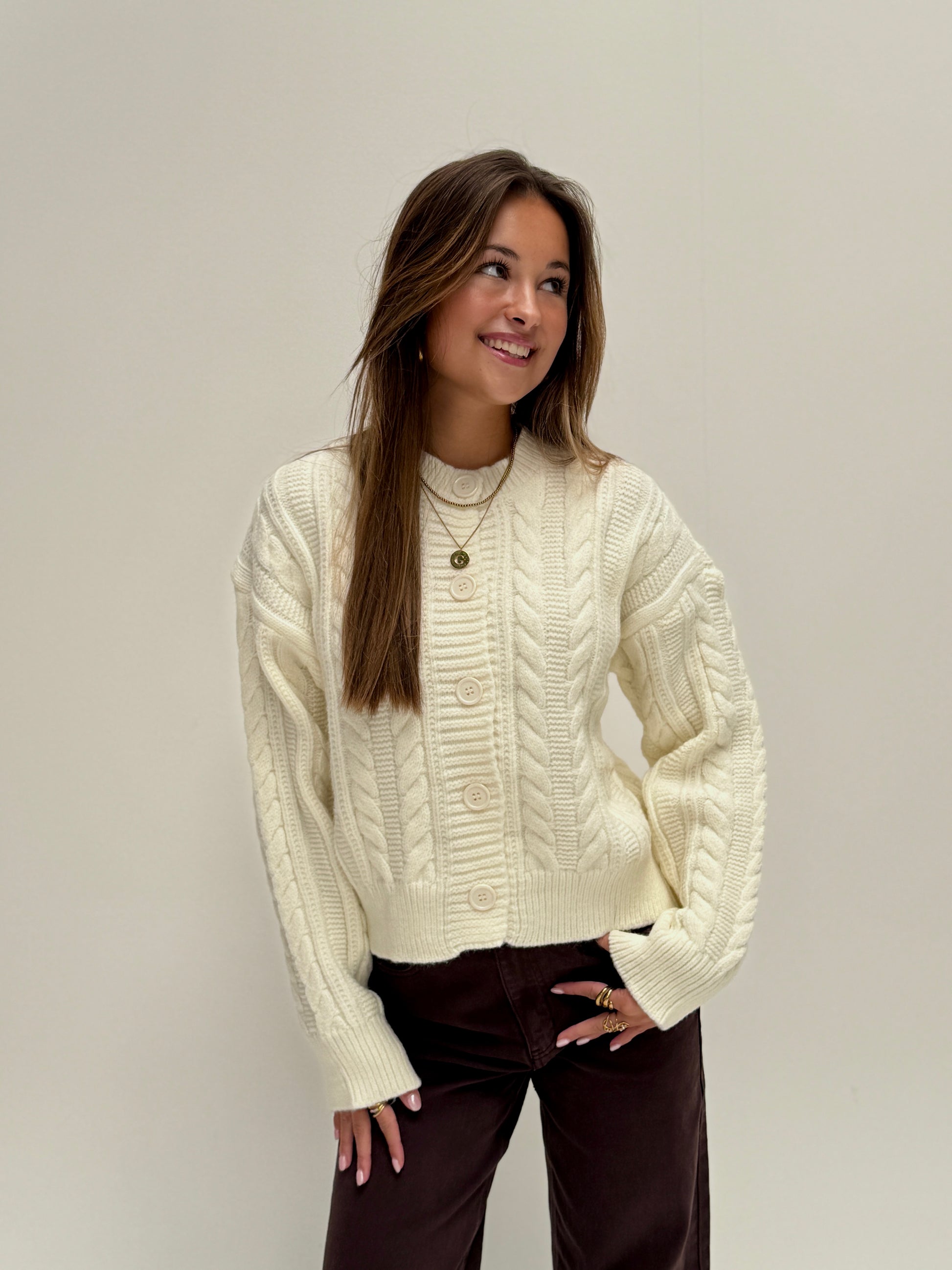 Dit vestje is een echte fall essential! Heerlijk warm en comfortabel te dragen en kriebelt niet! Sluit met knopen aan de voorkant en heeft een kabel patroon!