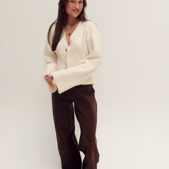 The fall essential! Deze knit cardigan is de perfecte mix van comfy en classy! De zachte stof voelt heerlijk aan, en de wijde mouwen en cropped fit zorgen voor een effortless stylish look! De top heeft een V-hals met knoopsluiting. Go get your new fave!